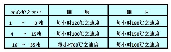 1.硼酸與硼甘是一般常用的干式搗打料之燒結劑,前者含有結晶水,故其升溫曲線要稍緩于后者。爐子的大小與爐襯之厚度,亦會影響升溫曲線,下列之升溫速率可作為參考: